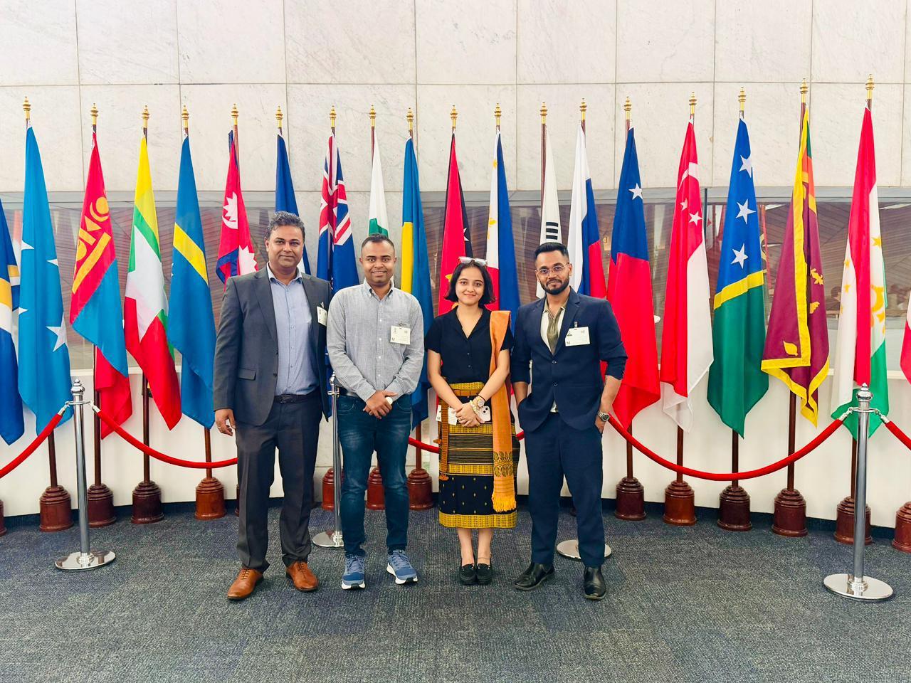 From left to right, Vishwa Ranjan Sinha (Senior Programme Officer, IUCN) with Mrinal, Brinda, and Pavel, training participants from Youth4Meghna at the United Nations Conference Centre (UNESCAP). Bangkok, December 2025